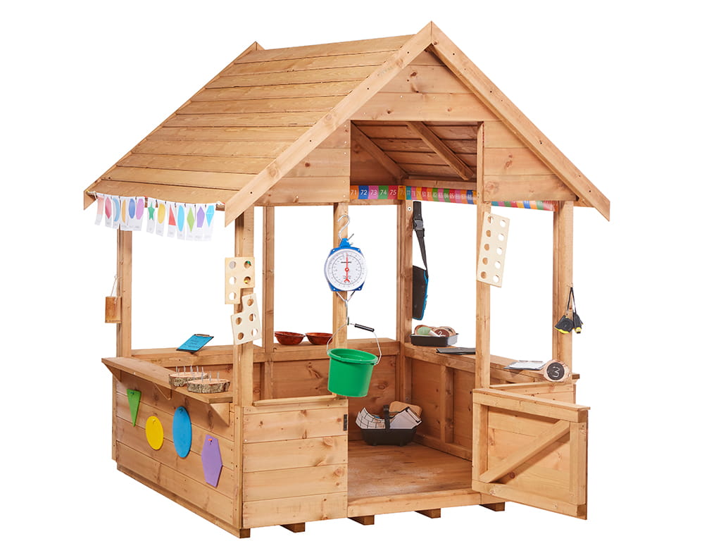 Ανοιχτό, ξύλινο σπίτι παιχνιδιού, ιδανικό για αυλές σχολείων. Στιβαρή κατασκευή από ξύλο, σε φυσικό χρώμα. Τα παιδιά θα το λατρέψουν και οι εκπαιδευτικοί θα έχουν καλή οπτική επαφή. Μπορείτε να το εμπλουτήσετε με αξεσουάρ και να το μετατρέψετε σε μαγαζάκι, σε σπίτι ή ότι άλλο μπορείτε να φανταστείτε.