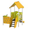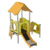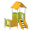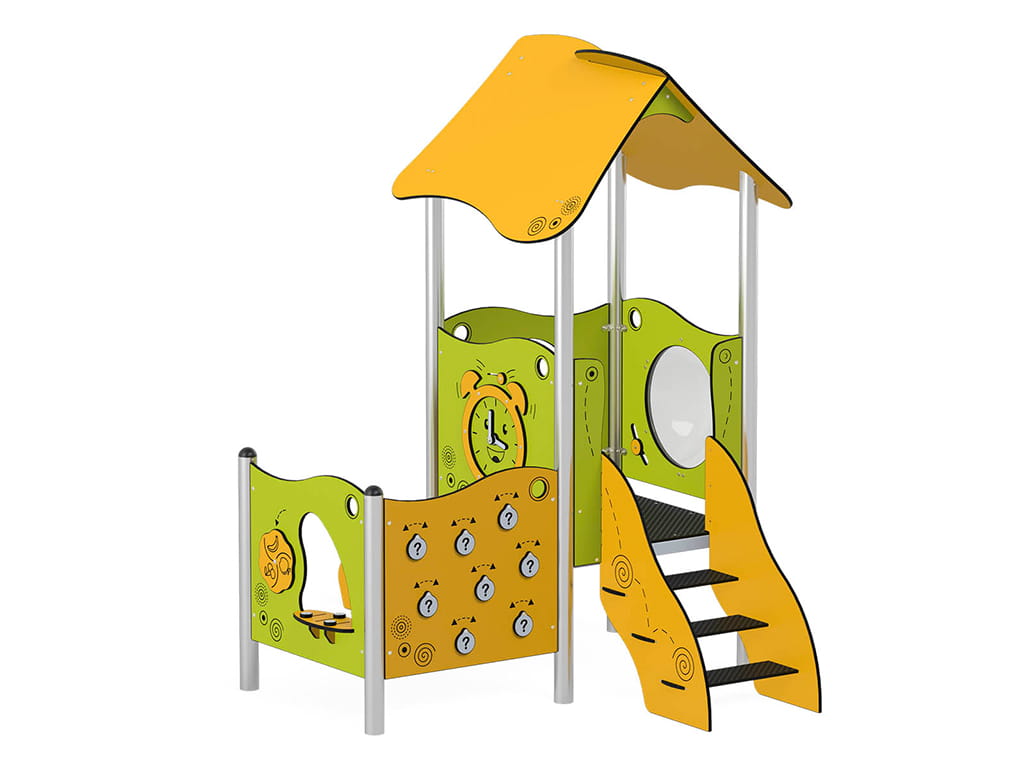 Η σύνθεση περιλαμβάνει διάφορες δραστηριότητες που ενθαρρύνουν τη σωματική και γνωστική ανάπτυξη των παιδιών: πλατφόρμα 90×90 εκ. σε ύψος 60 εκ., σκαλοπάτια 60 εκ., τσουλήθρα 60 εκ., στέγη με ανοιχτή γωνία, πάνελ τσουλήθρας, πάνελ παραθύρου, πάγκο καταστήματος, ρολόι και πάνελ μνήμης. Ιδανική για παιδικές χαρές, σχολεία και εξωτερικούς χώρους όπου τα παιδιά μπορούν να παίξουν με ασφάλεια και διασκέδαση.