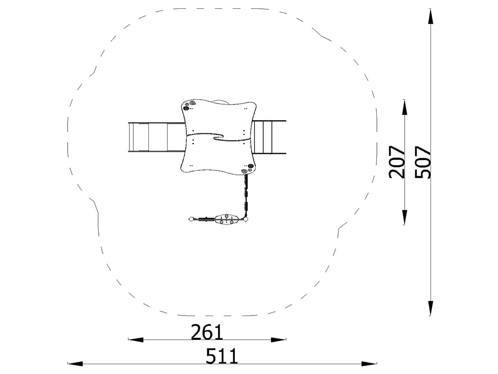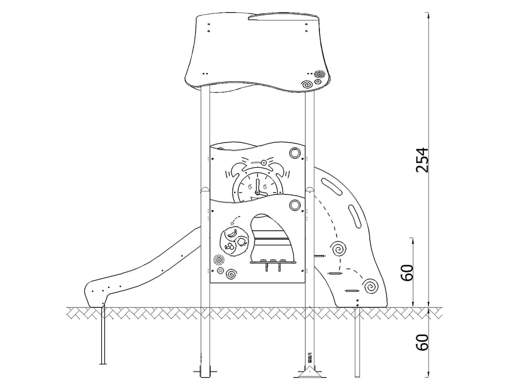Η σύνθεση περιλαμβάνει πολυκαρβονικό παράθυρο διαμέτρου 50 εκ., σκαλοπάτια από αντιολισθητικό HPL 12 χιλ. και ενισχυμένα καπάκια στα δοκάρια. Όλα τα συνδετικά και μεταλλικά στοιχεία είναι ανθεκτικά στις καιρικές συνθήκες και στην υπεριώδη ακτινοβολία, εξασφαλίζοντας μακροχρόνια χρήση. Η εγκατάσταση γίνεται απευθείας στο έδαφος για σταθερότητα και ασφάλεια.
