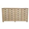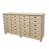 Κατασκευασμένη από συνθετικό ξύλο M.D.F. με επένδυση οξιάς, λουστραρισμένη στο φυσικό χρώμα του ξύλου. Έχει 24 ατομικά συρτάρια για την αποθήκευση των εργασιών των νηπίων τα οποία είναι διακοσμημένα με κυματιστό λουκάκι χαραγμένο σε ηλεκτρονικό μηχάνημα ακριβείας. Υπάρχει η δυνατότητα τα συρτάρια να φέρουν ξύλινο διακριτικό σήμα ( για να ξεχωρίζει κάθε νήπιο το συρτάρι του). Όλα τα άκρα είναι στρογγυλεμένα και ακίνδυνα για τα νήπια. Τα χρώματα και τα βερνίκια που χρησιμοποιούνται είναι νερού, μη τοξικά και φιλικά προς το περιβάλλον. Διαστάσεις: 124 x 40 x 82 εκατοστά. Καθαρή εσωτερική διάσταση συρταριού: 29,5 x 35,5 x 9 εκ. Κατασκευασμένη σύμφωνα με τα πρότυπα: ΕΝ 71-1:2014, ΕΝ 71-2:2011+Α1:2014, ΕΝ 71-3:2013+Α1:2014