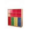 Κατασκευασμένη από συνθετικό ξύλο M.D.F. 17 χιλ. με επένδυση οξιάς, λουστραρισμένη όλος ο σκελετό στο φυσικό χρώμα του ξύλου, τα συρταράκια σε διάφορους χρωματικούς συνδυασμούς και η πλάτη (πισινό) χρωματιστή. Έχει 24 ατομικά συρτάρια (σε 4 στήλες) για την αποθήκευση των εργασιών των νηπίων τα οποία είναι διακοσμημένα με διπλό κυματιστό λουκάκι (αριστερά της χουφτίτσας) χαραγμένο σε ηλεκτρονικό μηχάνημα ακριβείας και στο επάνω μέρος έχει δύο ράφια. Τα συρτάρια αντί για πόμολο φέρουν τρυπημένη χουφτίτσα για να εξυπηρετούνται καλύτερα τα νήπια και για μεγαλύτερη ασφάλεια. Τα συρτάρια είναι και αυτά κατασκευασμένα από συνθετικό ξύλο M.D.F. 17 χιλ. Κάθε συρτάρι θα φέρει ξύλινο διακριτικό σήμα (24 διαφορετικά για να ξεχωρίζει κάθε νήπιο το συρτάρι του). Στο κάτω μέρος φέρει 4-5 πλαστικά, βιδωτά τακάκια για την προστασία των πλαϊνών του και για την εύκολη μετακίνησή της. Η πλάτη του επίπλου (πισινό) είναι χωνευτή σε ειδικές πατούρες. Όλα τα άκρα είναι στρογγυλεμένα και ακίνδυνα για τα νήπια. Τα χρώματα και τα βερνίκια που χρησιμοποιούνται είναι νερού, μη τοξικά και φιλικά προς το περιβάλλον. Διαστάσεις: 143 x 45 x 163 εκ. Καθαρή εσωτερική διάσταση συρταριού: 29,5 x 35,5 x 9 εκ.