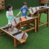 Το σύστημα νερού και άμμου περιλαμβάνει 3 πλαίσια κατασκευασμένα από ξύλο, με συρόμενα κομμάτια πλεξιγκλάς που λειτουργούν ως φράγματα και μία βρύση.