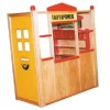 Κατασκευασμένο από ξύλο φουρνιστής οξιάς και από συνθετικό ξύλο MDF με επένδυση οξιάς. Εσωτερικά έχει ραφάκια στη μία πλευρά, πάγκο και γκισέ από plexi glass. Στην άλλη πλευρά εξωτερικά έχει γραμματοκιβώτιο και παράθυρο. Συνοδεύεται από τρεις επιγραφές, χαραγμένες σε ηλεκτρονικό μηχάνημα ακριβείας, που αλλάζουν εύκολα ανάλογα με την χρήση της γωνιάς και αποθηκεύονται σε ειδικό ράφι εσωτερικά. Διαστάσεις: 135 x 100 Ύψος: 150 εκατοστά