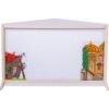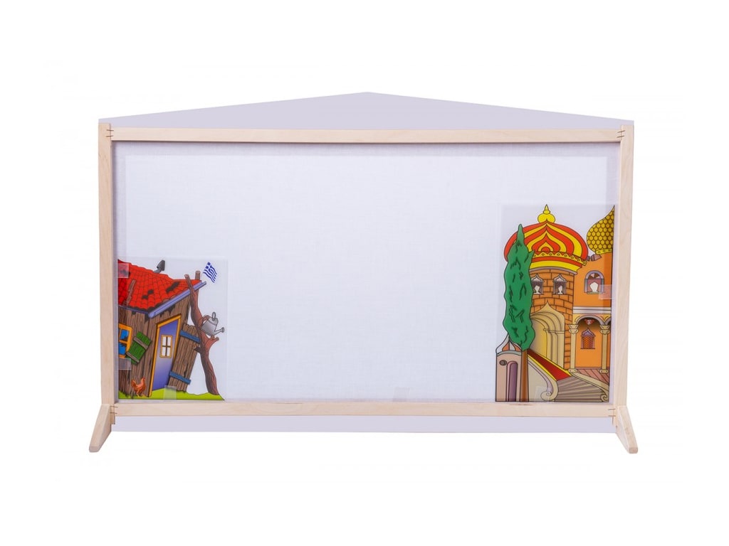 Ξύλινο θέατρο σκιών, ιδανικό για δημιουργικό παιχνίδι και αφήγηση ιστοριών. Διαθέτει μεγάλο πλαίσιο με οθόνη από βαμβακερό ύφασμα (μπερντές), που προσφέρει καθαρή και φωτεινή απεικόνιση των φιγούρων. Με διαστάσεις 88 x 57 εκ., προσφέρει άνετο χώρο για παραστάσεις, ενώ τα σταθερά πλαϊνά στηρίγματα εξασφαλίζουν εύκολη τοποθέτηση σε κάθε επιφάνεια. Κατάλληλο τόσο για παιδιά όσο και για ενήλικες λάτρεις του θεάτρου σκιών.