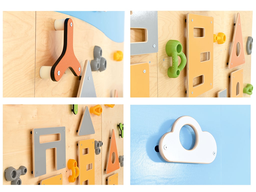 Η κατασκευή του από ανθεκτικό κόντρα πλακέ πάχους 18 χιλ. εξασφαλίζει σταθερότητα και ασφάλεια, ενώ οι λαβές μπορούν να αντέξουν έως 70 kg βάρος. Ο τοίχος αποτελείται από 3 επιμέρους τμήματα, σχηματίζοντας μια ενιαία επιφάνεια αναρρίχησης με διαστάσεις 243 x 241 εκ.