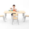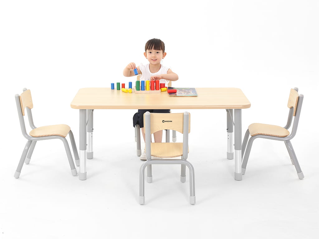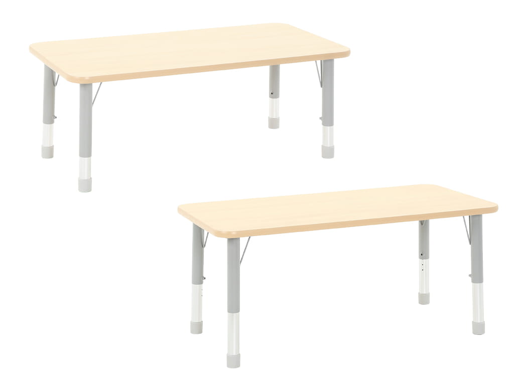 Το ορθογώνιο ξύλινο τραπέζι με ρυθμιζόμενο ύψος αποτελεί μια πρακτική και ευέλικτη λύση για χώρους παιδικών δραστηριοτήτων και σχολεία όλων των βαθμίδων. Η επιφάνεια από ανθεκτικό MDF πάχους 28 χιλ. με επένδυση μελαμίνης σε όψη σφένδαμου είναι σταθερή, εύκολη στον καθαρισμό και προστατεύεται από πλαστικά περιθώρια στις άκρες για μεγαλύτερη ασφάλεια.