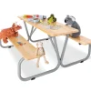 Τραπέζι πικ νικ μεαλλικό αποτελούμενο από 2 παγκάκια με 1 τραπέζι, χώρος για 6 παιδιά. Από μασίφ ξύλο πεύκου, με διάφανο φινίρισμα λάκας και ιδιαίτερα σταθερό χάρη στον γκρι μεταλλικό σκελετό. Με πιστοποίηση FSC®Mix (FSC-C120795). Ιδανικό για δραστηριότητες έξω στον κήπο ή στη βεράντα, όπως παιχνίδι, φαγητό ή απλά την απόλαυση του. Απαιτείται συναρμολόγηση. Βάρος: 19 kg. Διαστάσεις: 110 x 110 x 53 εκ. Ύψος καθίσματος: 32 εκ. Ηλικία: 3 ετώ και άνω.