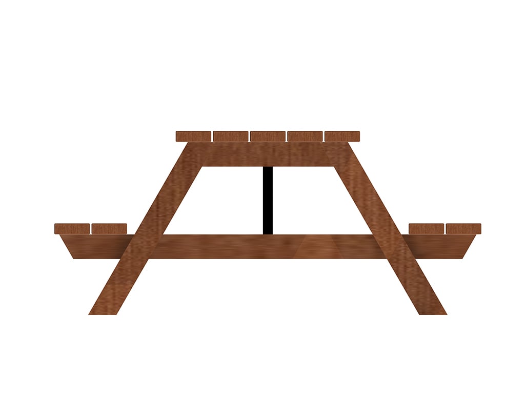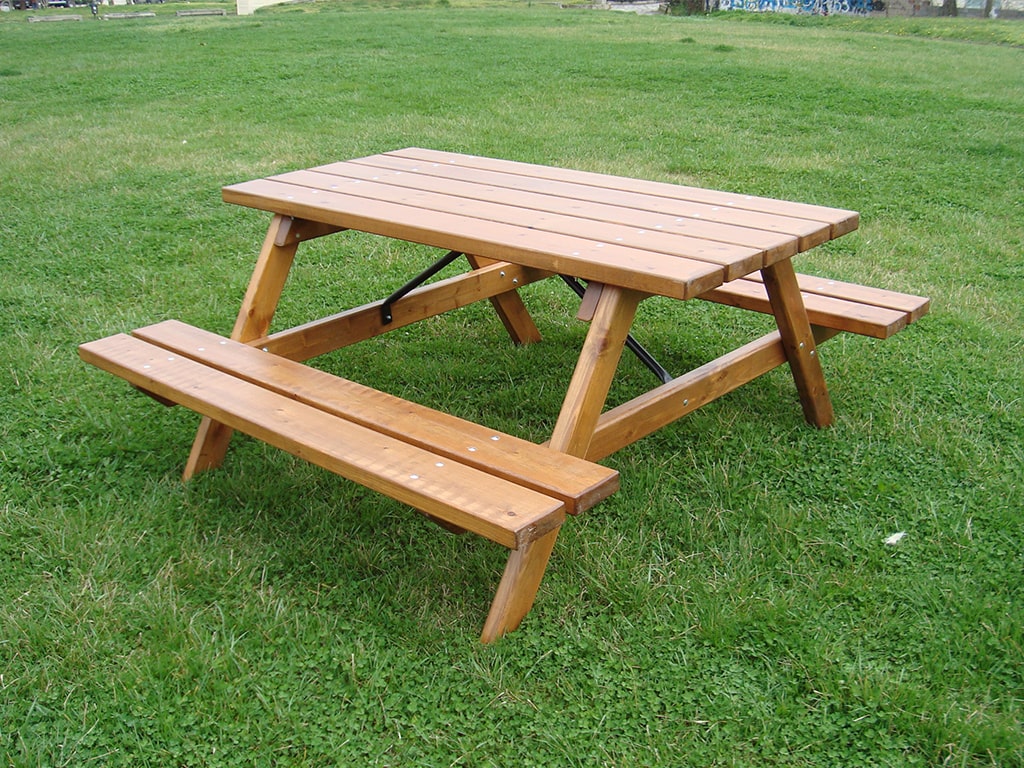 Το τραπέζι πκ νικ στηρίζεται σε δύο σκελετούς από δοκούς 9,5 x 4,5 εκ. σε σχήμα τραπεζίου. Στο πάνω μέρος των σκελετών βιδώνεται επιφάνεια πάγκου από πέντε δοκούς 13,5 x 4,5 εκ. Εκατέρωθεν του πάγκου βιδώνονται δύο επιφάνειες για κάθισμα από δοκούς ίδιας διατομής με τον πάγκο. Ο σκελετός ενισχύεται με ξύλινη κόντρα.