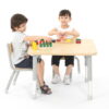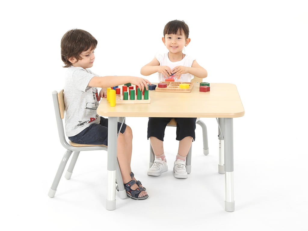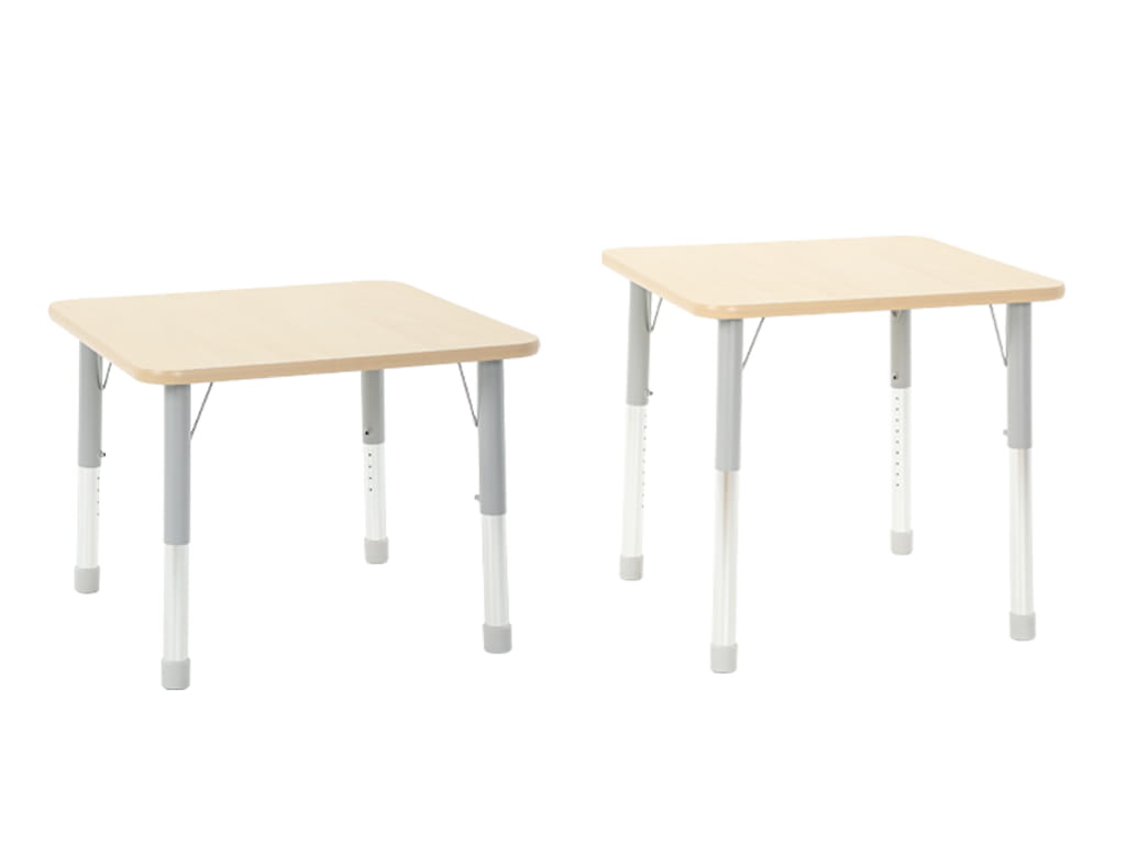 Το τετράγωνο ξύλινο τραπέζι με ρυθμιζόμενο ύψος αποτελεί μια πρακτική και ευέλικτη λύση για χώρους παιδικών δραστηριοτήτων και σχολεία όλων των βαθμίδων. Η επιφάνεια από ανθεκτικό MDF πάχους 28 χιλ. με επένδυση μελαμίνης σε όψη σφένδαμου είναι σταθερή, εύκολη στον καθαρισμό και προστατεύεται από πλαστικά περιθώρια στις άκρες για μεγαλύτερη ασφάλεια.
