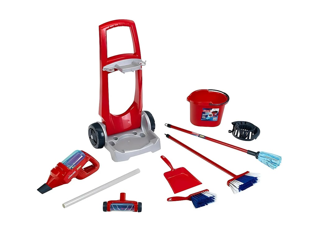 Τρόλεϊ καθαριότητας vileda. Περιλαμβάνει σκούπα, σκουπάκι με φαράσι, σφουγγαρίστρα και κουβά. Από πλαστικό υλικό υψηλής ποιότητας και απεριόριστης αντοχής. Ύψος 57 εκατοστά