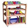 Κατασκευασμένο από ξύλο φουρνιστής οξιάς άριστης ποιότητας. Λουστραρισμένο στο φυσικό χρώμα του ξύλου με βερνίκι νερού, μη τοξικό και φιλικό προς το περιβάλλον. Έχει ειδικές θέσεις για την αποθήκευση οργάνων ρυθμικής και ψυχοκινητικής. Το επάνω ράφι κατά μήκος του είναι χωρισμένο από δύο τραβέρσες οι οποίες καταλήγουν πιο έξω από τον κυρίως σκελετό του επίπλου και χρησιμεύουν για το κρέμασμα στεφανιών. Διαστάσεις: 95 x 69 x 107 εκατοστά ύψος. Περιλαμβάνονται: 4 μπάρες, 4 στεφάνια 35 εκατοστά, – 4 στεφάνια 65 εκατοστά, 4 ράβδοι 35 εκατοστά, 4 ράβδοι 70 εκατοστά, 8 τούβλα στήριξης, 8 μισά τούβλα στήριξης, 4 μπάλες ρυθμικής, 4 σχοινάκια διαδρομών, σχοινάκια, σακουλάκια ισορροπίας, 4 τούβλα, 4 κορίνες, συνδετικά
