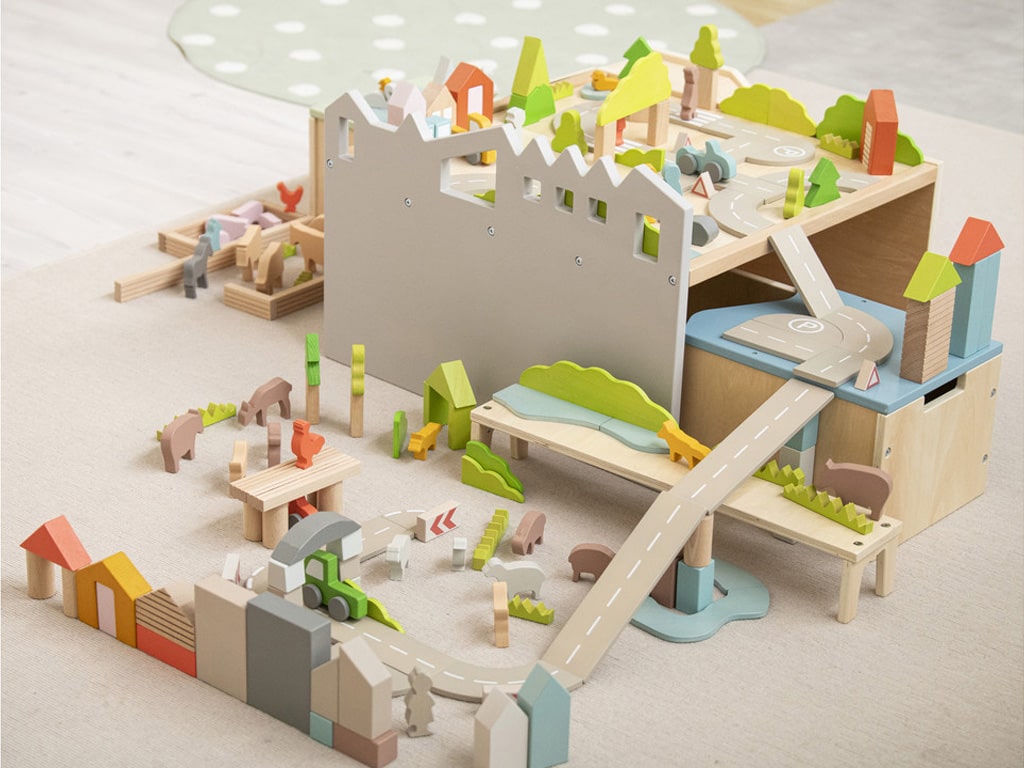 Αυτό το τρολεϊ είναι ιδανικό για δημιουργικά και ανοιχτού τύπου παιχνίδια με τουβλάκια, που ενθαρρύνουν τα παιδιά να εξερευνήσουν, να φανταστούν και να εκφραστούν ελεύθερα. Περιλαμβάνει 225 κομμάτια σε 5 χωριστά διαμερίσματα: δρόμους, τοπία, φιγούρες, ζώα και βασικά τουβλάκια. Τα παιδιά μπορούν να φτιάξουν δικές τους πόλεις και ιστορίες, παίζοντας και μαθαίνοντας ταυτόχρονα. Τα κομμάτια είναι σχεδιασμένα με όμορφα χρώματα και βοηθούν στην ανάπτυξη της φαντασίας, της δημιουργικότητας και της οργάνωσης. Το τρολεϊ έχει ροδάκια για εύκολη μετακίνηση και τα συρτάρια στοιβάζονται για εξοικονόμηση χώρου.