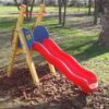 Η σκάλα ανάβασης κατασκευάζεται από τέσσερις ξύλινες επικολλητές δοκούς 10 x 10 εκ. που ενώνονται ανά δύο σε σχήμα “λ”. Ανάμεσα στις δοκούς συγκολλούνται τα σκαλοπάτια από σιδηροσωλήνα Φ26 χιλ. και στην εξωτερική πλευρά οι χειρολαβές από σιδηροσωλήνα ίδιας διατομής. Η πλατφόρμα κατασκευάζεται από ένα ξύλινο πλαίσιο εντός του οποίου τοποθετείται επιφάνεια από κόντρα πλακέ θαλάσσης. Στην απέναντι πλευρά από τη σκάλα τοποθετείται η ευθεία τσουλήθρα, χωρίς αλλαγές πορείας ή κλίσης στο μήκος της, κατασκευασμένη από χαμηλής πυκνότητας πολυαιθυλένιο. Η ζώνη εισόδου έχει δύο πλαϊνά προστατευτικά από κόντρα πλακέ θαλάσσης και μία οριζόντια μπάρα εισόδου από σιδηροσωλήνα Φ26 χιλ.
