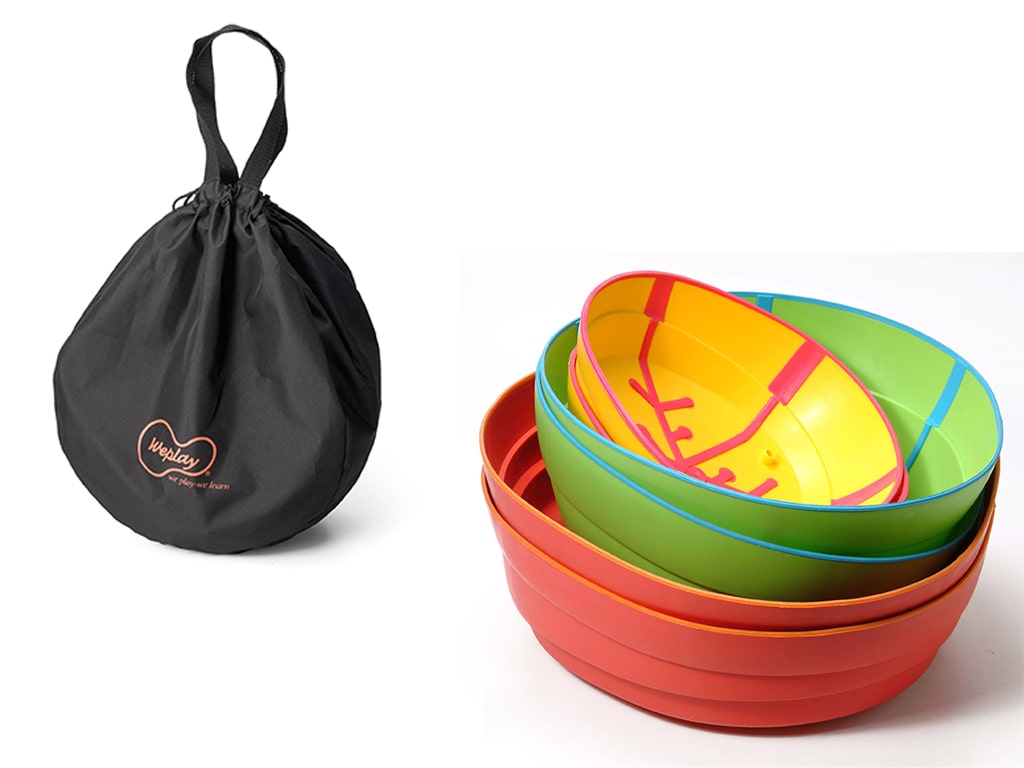 Οι διαφορετικές κλίσεις και μεγέθη επιτρέπουν τη δημιουργία διαδρομών κάθε δυσκολίας, είτε σε ίσιες γραμμές είτε σε πιο φανταστικές διαδρομές. Το σετ αποθηκεύεται εύκολα χάρη στην πρακτική τσάντα μεταφοράς και είναι ιδανικό για παιχνίδι ξυπόλητα, ώστε τα παιδιά να απολαμβάνουν πλήρη αισθητηριακή εμπειρία.