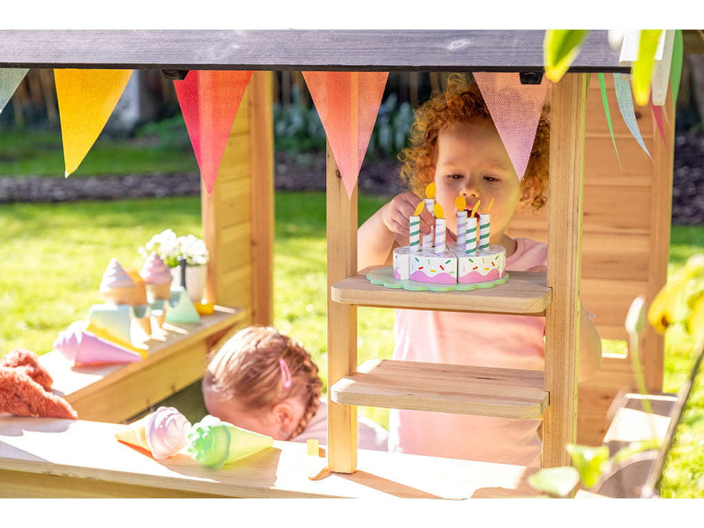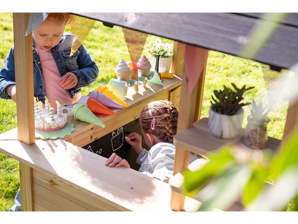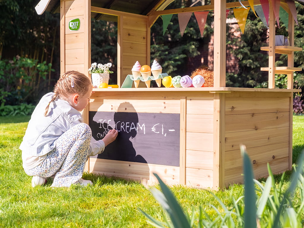 Το ξύλινο μαγαζάκι εξωτερικού χώρου είναι το ιδανικό παιχνίδι για να ζήσουν τα παιδιά αμέτρητες δημιουργικές και φανταστικές περιπέτειες στον κήπο, κάθε μέρα. Λεπτομέρειες όπως ο πάγκος, ο φράχτης, τα ράφια με μαυροπίνακα και η παιχνιδιάρικη σκεπή με τροχό ρόλων δίνουν μια όμορφη τελική πινελιά. Με μια απλή περιστροφή εμφανίζεται ένα από οκτώ διαφορετικά θέματα, μετατρέποντας το ξύλινο σπιτάκι σε παγωτατζίδικο, ιατρείο, αστυνομικό τμήμα, μπακάλικο, κουκλοθέατρο, εστιατρόριο κ.α.