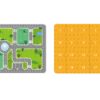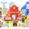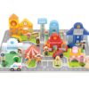 Το ξύλινο οικοδομικό υλικό με ταμπλό-παζλ, είναι κατασκευασμένο από ξύλο οξιάς και βαμμένο με μη τοξικά χρώματα. Το σετ περιλαμβάνει 60 πολύχρωμα blocks με τα οποία τα παιδιά θα κατασκευάσουν διάφορα κτίρια όπως, παγωτατζίδικο, τσίρκο, σχολείο, αεροδρόμιο, πυροσβεστική και νοσοκομείο. Μπορούν να τα τοποθετήσουν όπου θέλουν πάνω στο ταμπλό που αποτελείται από 20 αριθμημένα κομμάτια παζλ. Επίσης περιλαμβάνονται 6 χαρακτήρες που αντιστοιχούν σε επαγγέλματα, 4 οχήματα (σχολικό λεωφορείο, ασθενοφόρο, αστυνομικό αυτοκίνητο και πυροσβεστική), 1 δέντρο, οδικές πινακίδες, μπαλόνια, μαϊμού και 1 τροχός. Το σετ έρχεται σε κουβά με χερούλι για εύκολη αποθήκευση και μεταφορά.