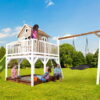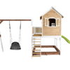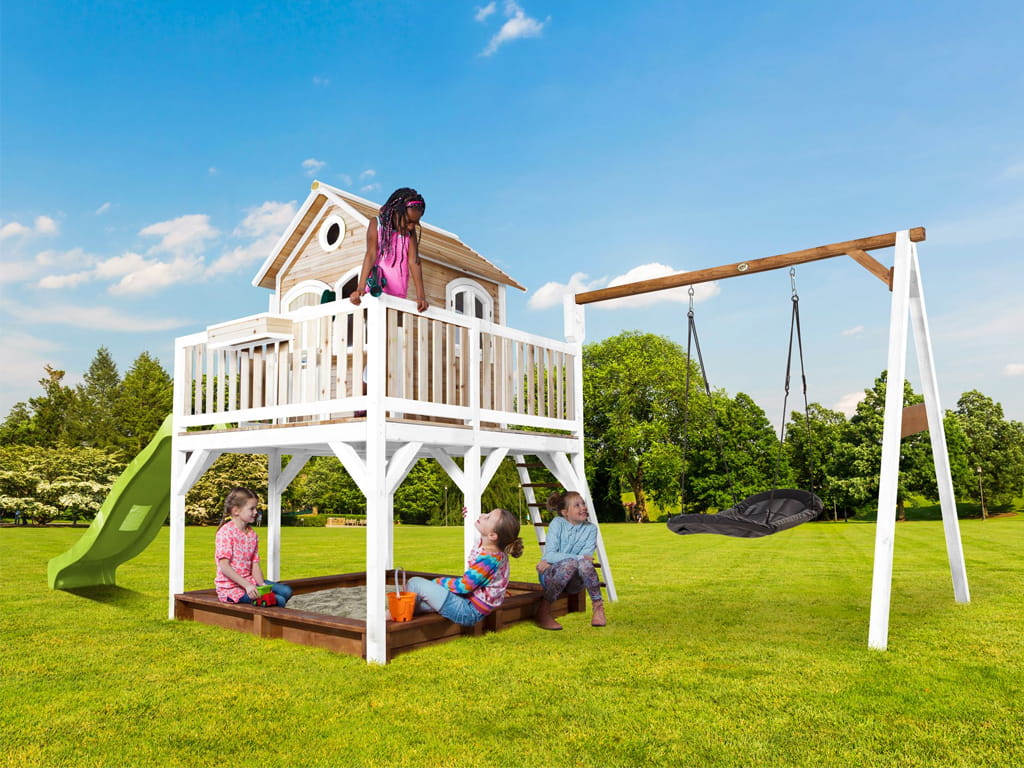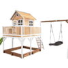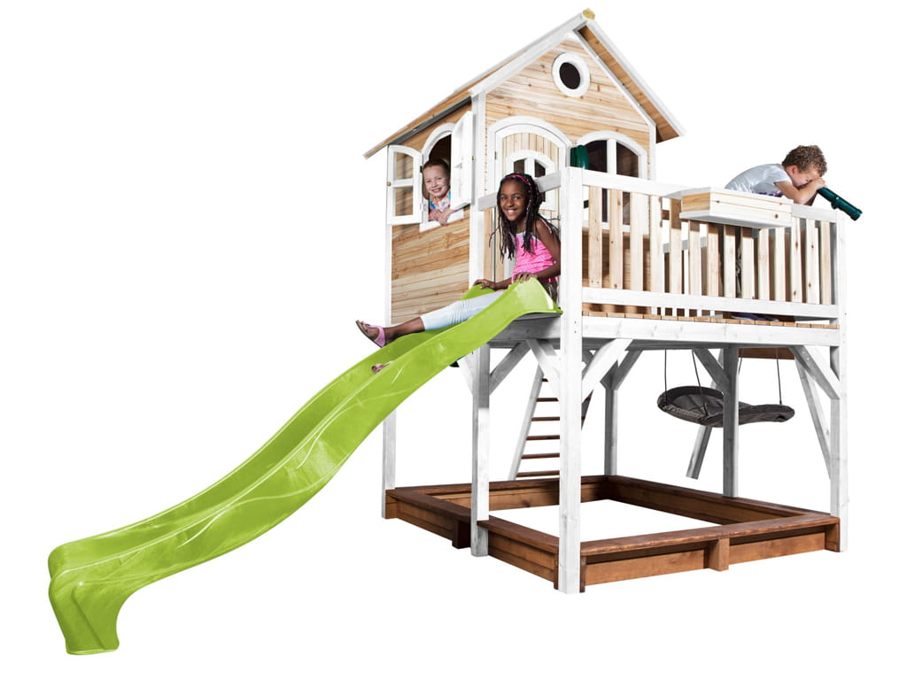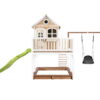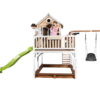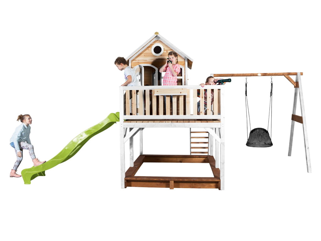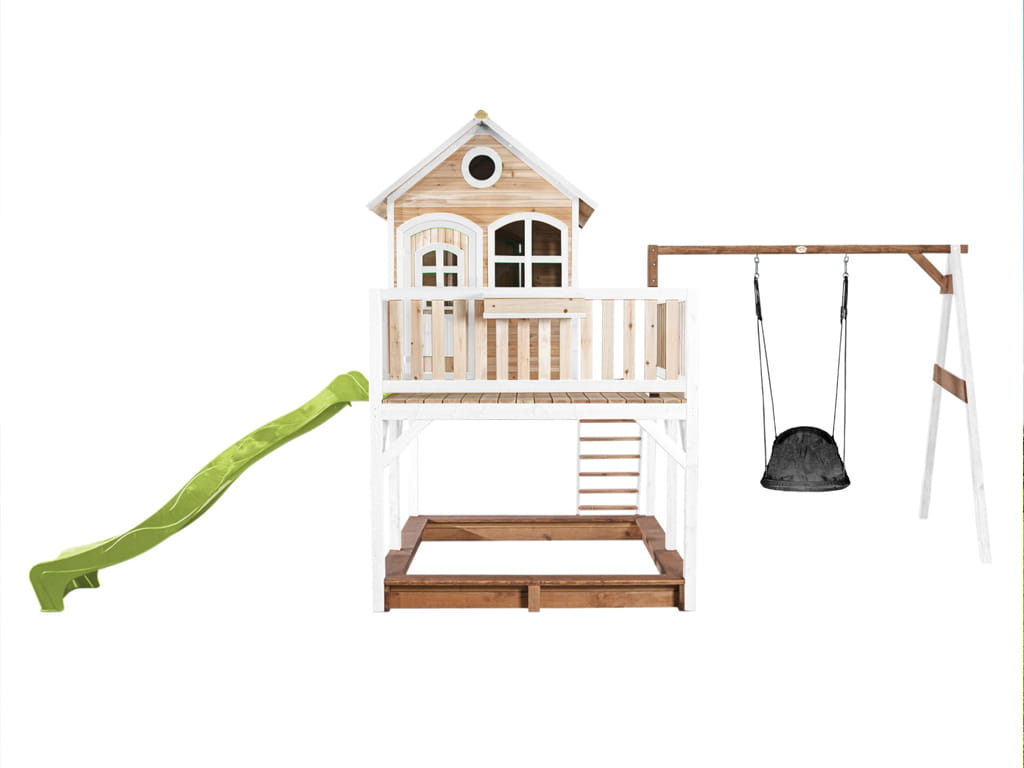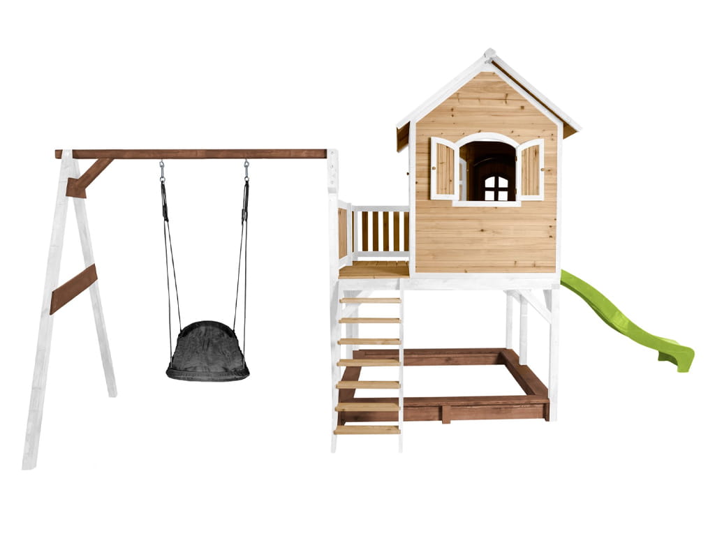 Το ξύλινο σπιτάκι παιδικής χαράς, συνδυάζει δημιουργικό παιχνίδι, κίνηση και διασκέδαση για ώρες. Με μεγάλη βεράντα, πλατφόρμα ύψους 118 εκ., τσουλήθρα 228 εκ., κούνια-αιώρα και αμμοδόχο, τα παιδιά μπορούν να σκαρφαλώνουν, να κατεβαίνουν τη τσουλήθρα, να παίζουν στην άμμο ή να οργανώνουν φανταστικά παιχνίδια μέσα και γύρω από το σπίτι. Η κούνια-αιώρα προσφέρει επιπλέον διασκέδαση, με μεγάλη επιφάνεια καθίσματος, ρυθμιζόμενο ύψος και ανθεκτικά σχοινιά, ώστε τα παιδιά να κούνιανται με ασφάλεια μόνα τους ή με φίλους.