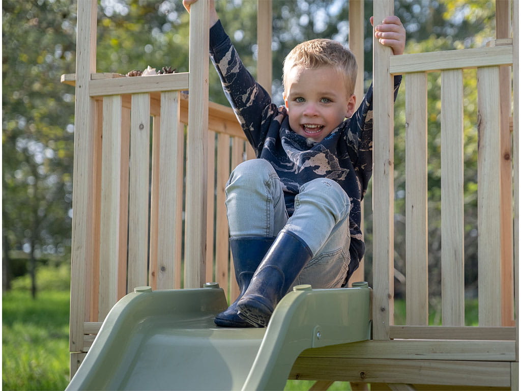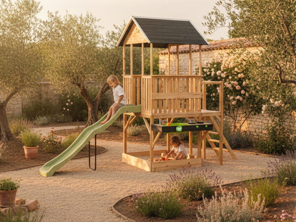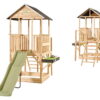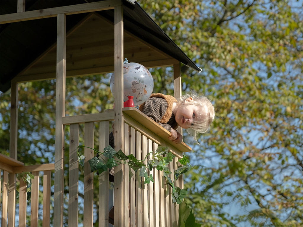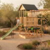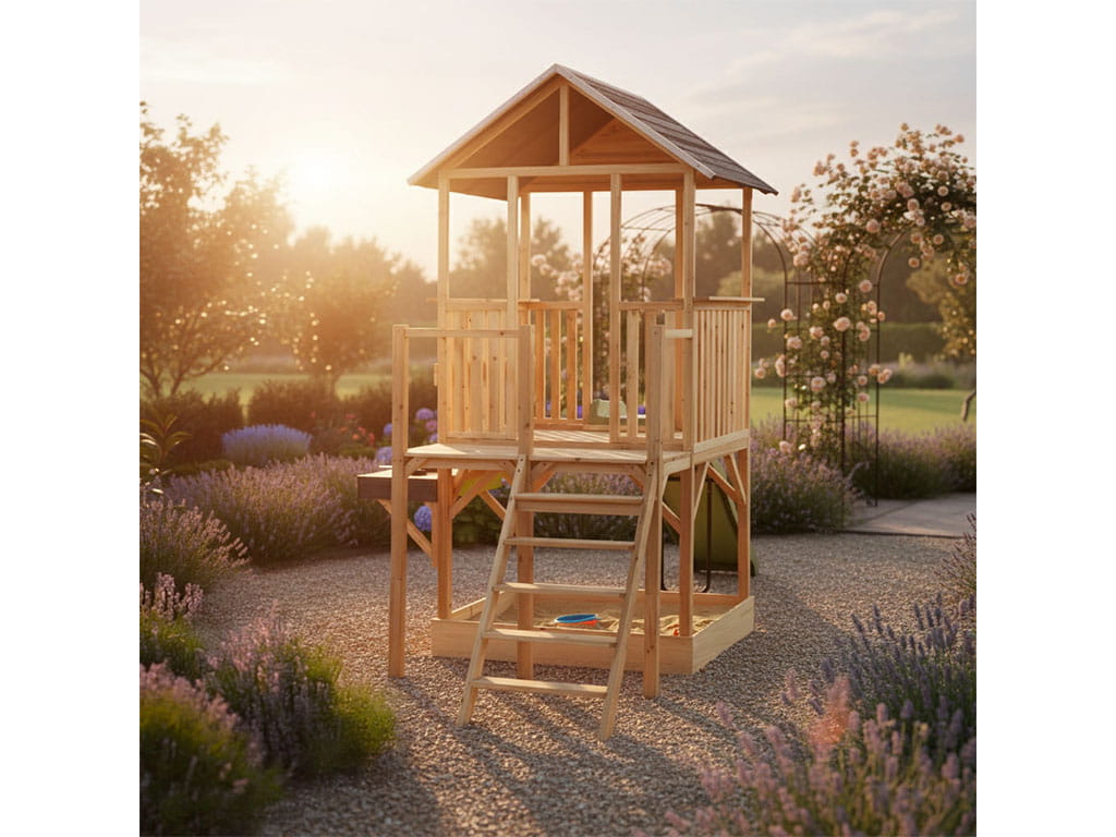 Το ξύλινο σπιτάκι με τσουλήθρα, κουζίνα και αμμοδόχο αποτελεί έναν ολοκληρωμένο χώρο παιχνιδιού για τον κήπο, προσφέροντας αμέτρητες ώρες διασκέδασης και δημιουργίας. Με υπερυψωμένη κατασκευή και ανοιχτό σχεδιασμό, επιτρέπει στα παιδιά να κινούνται άνετα, να παίζουν μαζί και να απολαμβάνουν τη θέα του κήπου από ψηλά. Η πρόσβαση γίνεται μέσω σκάλας, ενώ η κατάβαση με την τσουλήθρα χαρίζει ακόμα περισσότερη χαρά και δράση.