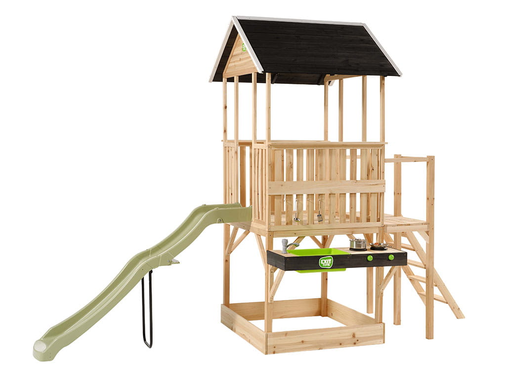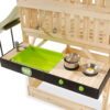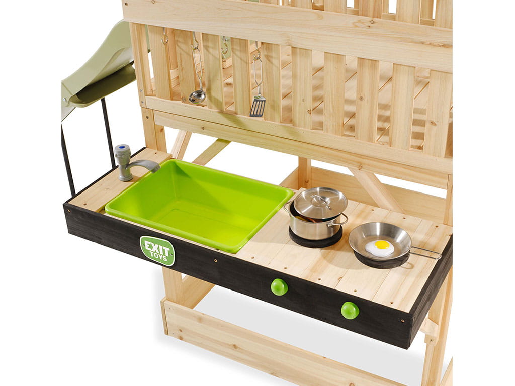 Κάτω από το σπιτάκι υπάρχει ενσωματωμένη αμμοδόχος, ιδανική για κατασκευές με άμμο, ενώ στο πλάι βρίσκεται η ξύλινη παιδική κουζίνα. Εκεί, τα παιδιά μπορούν να δημιουργήσουν τα δικά τους «μαγειρικά» παιχνίδια, χρησιμοποιώντας την εστία, τον αποσπώμενο νεροχύτη και τη βρύση που μπορεί να συνδεθεί με λάστιχο κήπου για πραγματική ροή νερού. Με τα αξεσουάρ κουζίνας, όπως σκεύη και παιχνίδια τροφίμων, το παιχνίδι γίνεται ακόμα πιο ρεαλιστικό και διασκεδαστικό.