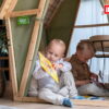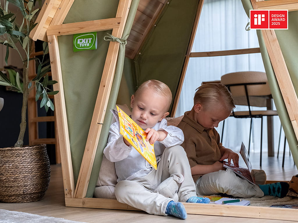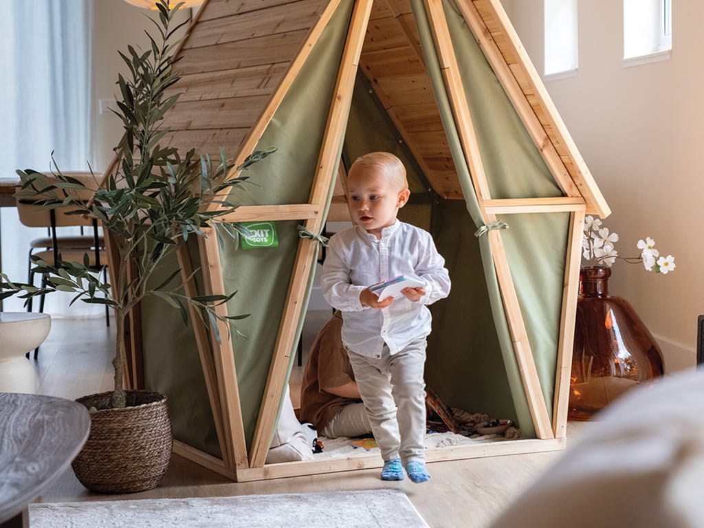 Τα παιδιά μπορούν να μπαίνουν και να βγαίνουν εύκολα και από τις δύο πλευρές, ενώ η μαγνητική κλειδαριά στο πίσω μέρος κλείνει αυτόματα τον καμβά. Οι πόρτες της σκηνής μπορούν να τυλιχτούν και να δεθούν στον ξύλινο σκελετό με κορδόνια, όπως σε πραγματική σκηνή. Το σπιτάκι προσφέρει αρκετό χώρο για περισσότερα παιδιά να παίζουν μαζί, ενισχύοντας τη συνεργασία και τη φαντασία.